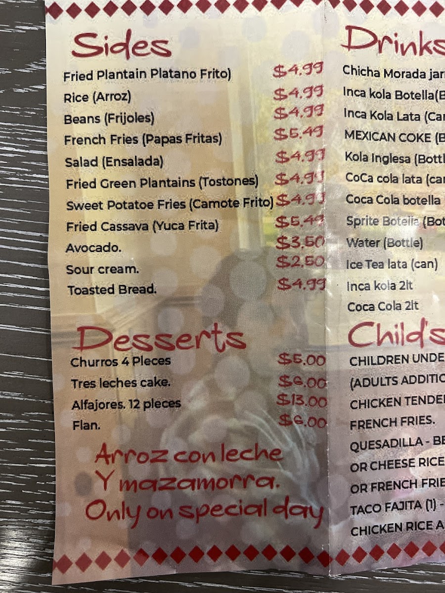 Side dishes are plentiful, with Platano Frito (fried plantains), Yuca Frita (fried cassava), and Arroz Tostones adding delicious and crispy textures to your meal. Papas Fritas (French fries) and the crunchy Tostones are also great accompaniments to any dish.