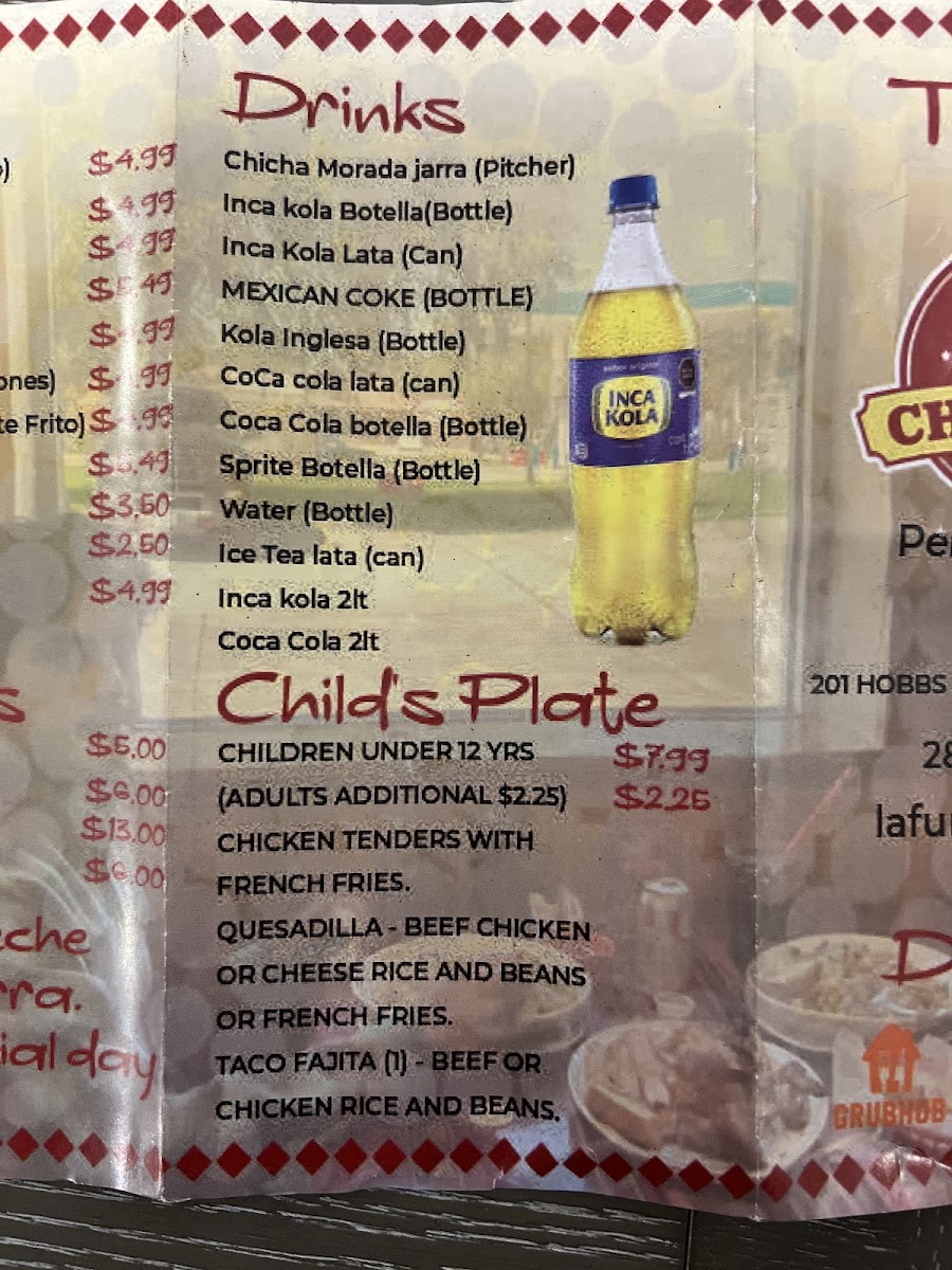 To complement your meal, La Furia Chalaca offers a selection of refreshing beverages, including Chicha Morada Botella, Inca Kola Botella, and the ever-popular Inca Kola Lata. For a more generous serving, the Chicha Morada Jarra is perfect for sharing and adds a sweet, fruity touch to your dining experience.